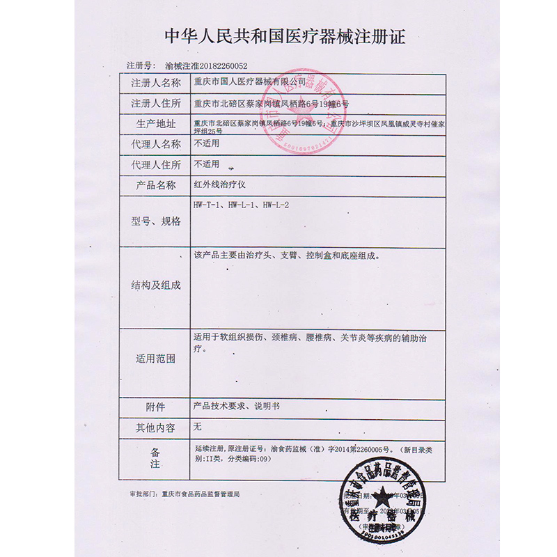 渝食藥監(jiān)械(準(zhǔn))字2014第2260005號(hào)/重慶市國(guó)人醫(yī)療器械有限公司 有效期至:2018-01-13紅外線(xiàn)治療儀