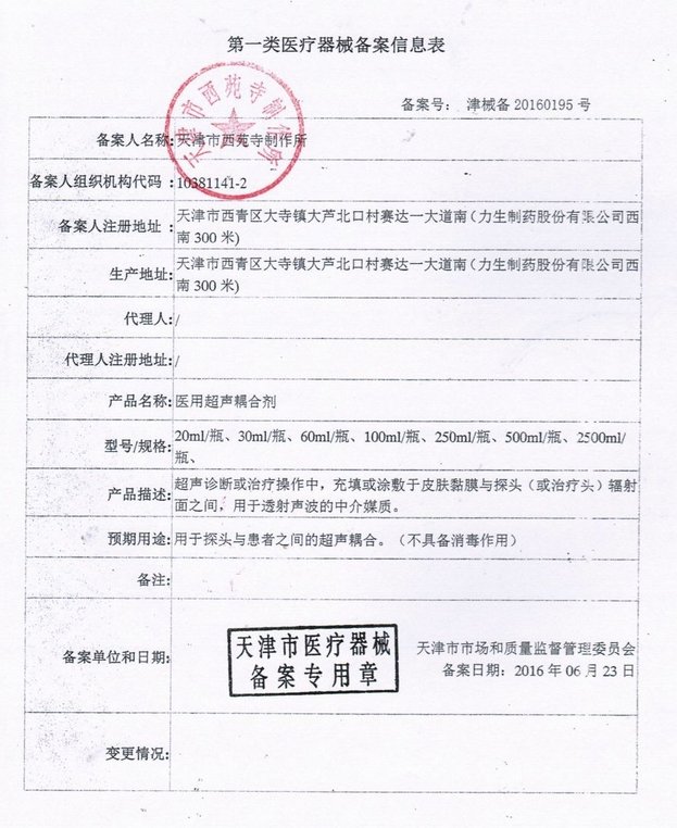 津食藥監(jiān)械(準(zhǔn))字2012第1230002號(hào)/天津市西苑寺制作所 有效期至:2016-10-24醫(yī)用超聲耦合劑