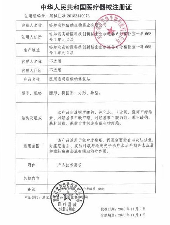 黑械注準(zhǔn)20142640020/哈爾濱運美達(dá)生物科技有限公司 有效期至:2023-07-22醫(yī)用透明質(zhì)酸鈉修復(fù)貼