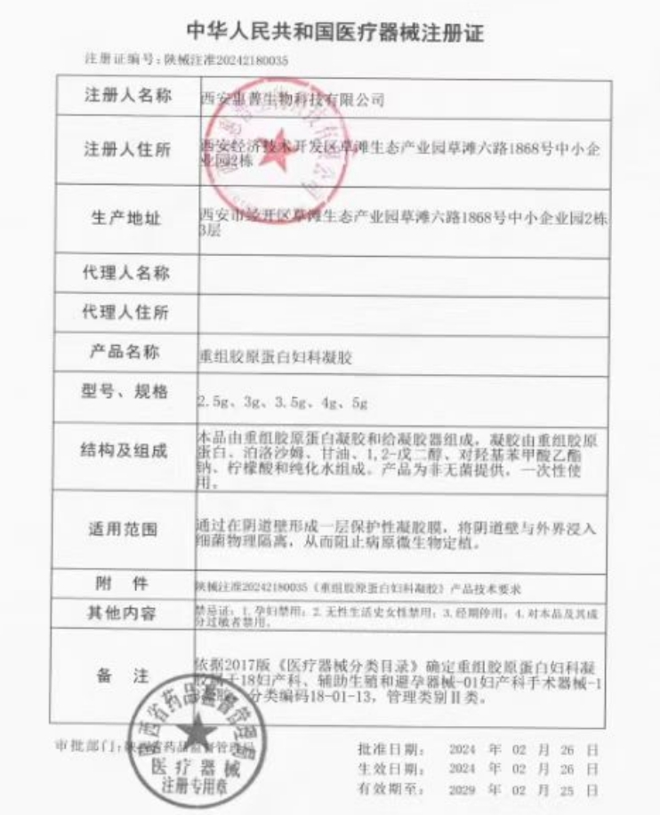 2024年12月陜西醫(yī)用耗材產(chǎn)品目錄動態(tài)調(diào)整掛網(wǎng)結(jié)果 重組膠原蛋白婦科凝膠 陜械注準20242180035 198.00