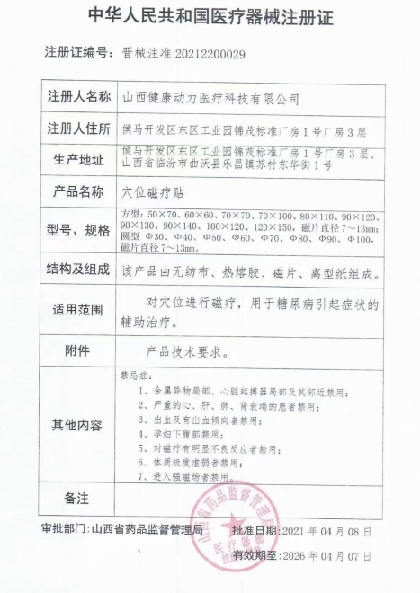 晉械注準20202200001/山西健康動力醫(yī)療科技有限公司 有效期至:2025-01-08穴位磁療貼