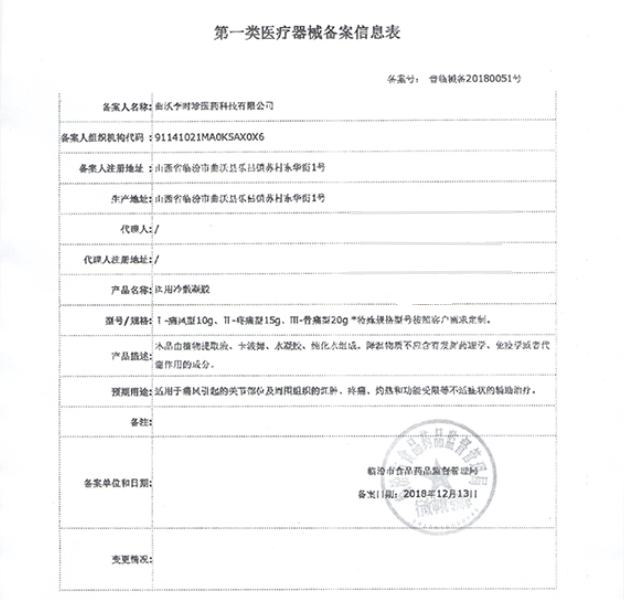 產(chǎn)品描述由“本品由植物提取液、卡波姆、水凝膠、純化水組成。降溫物質不應含有發(fā)揮藥理學、免疫學或者代謝作用的成分?!弊兏鼮椤氨酒酚山禍匚镔|(水凝膠、甘油)、純化水組成。降溫物質不應含有發(fā)揮藥理學、免疫學或者代謝作用的成分?!?;預期用途由“適用于痛風引起的關節(jié)部位及周圍組織的紅腫、疼痛、灼熱和功能受限等不適癥狀的輔助治療。”變更為“適用于痛風引起的關節(jié)部位及周圍組織的紅腫、疼痛、灼熱不適癥狀的輔助治療。”變更時間2020年01月19日;型號或規(guī)格由“Ⅰ-痛風型10g、Ⅱ-疼痛型15g、Ⅲ-骨痛型20g *特殊規(guī)格型號按照客戶需求定制?!弊兏鼮椤靶吞枺和达L型;規(guī)格:1-500g/ml”;產(chǎn)品描述由“本品由降溫物質(水凝膠、甘油)、純化水組成。降溫物質不應含有發(fā)揮藥理學、免疫學或者代謝作用的成分。”變更為“本品由降溫物質(水凝膠、甘油)、純化水組成。降溫物質不應含有發(fā)揮藥理學、免疫學或者代謝作用的成分?!?;預期用途由“適用于痛風引起的關節(jié)部位及周圍組織的紅腫、疼痛、灼熱不適癥狀的輔助治療?!弊兏鼮椤斑m用于痛風引起的關節(jié)部位及周圍組織不適癥狀的物理冷敷理療。僅用于閉合性軟組織?!弊兏鼤r間2021年01月28日