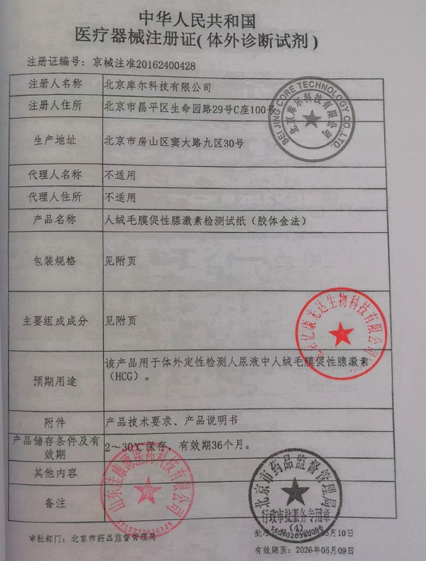 鄂械注準(zhǔn)20132401333/武漢璟泓科技股份有限公司 有效期至:2027-12-04人絨毛膜促性腺激素檢測試紙(膠體金法)