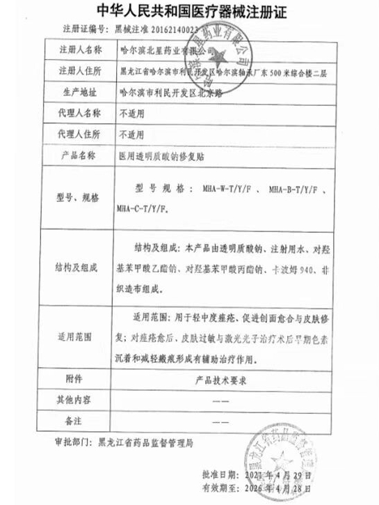 黑械注準(zhǔn)20162640023/哈爾濱三聯(lián)藥業(yè)股份有限公司 有效期至:2021-04-14醫(yī)用透明質(zhì)酸鈉修復(fù)貼