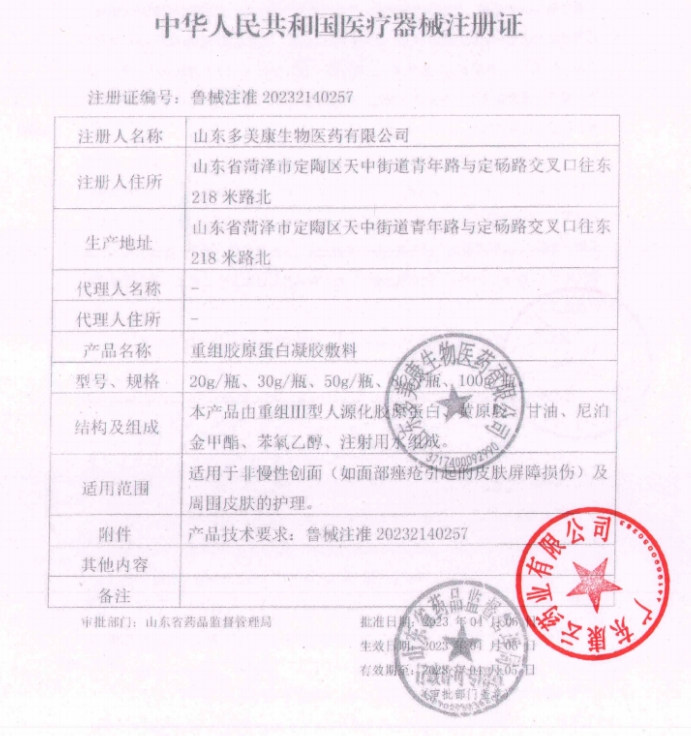 山東省醫(yī)用耗材限價(jià)掛網(wǎng)數(shù)據(jù) 重組膠原蛋白凝膠敷料 魯械注準(zhǔn)20232140257 30g/瓶 398.0000