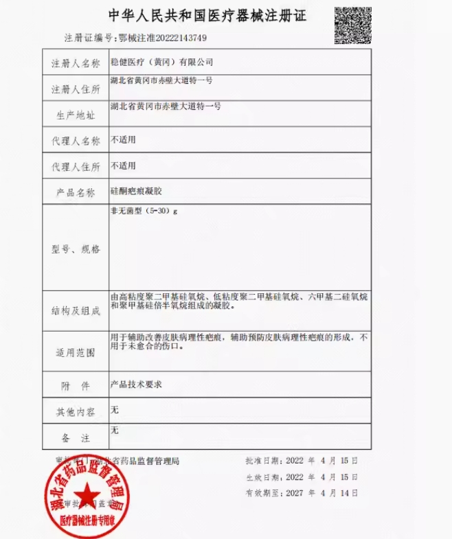瓊械注準(zhǔn)20222140028/海南鴻翼醫(yī)療器械有限公司 有效期至:2027-07-18硅酮疤痕凝膠