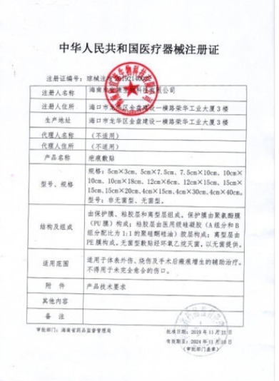 浙械注準(zhǔn)20162641095/杭州天誠藥業(yè)有限公司 有效期至:2021-12-18疤痕敷貼