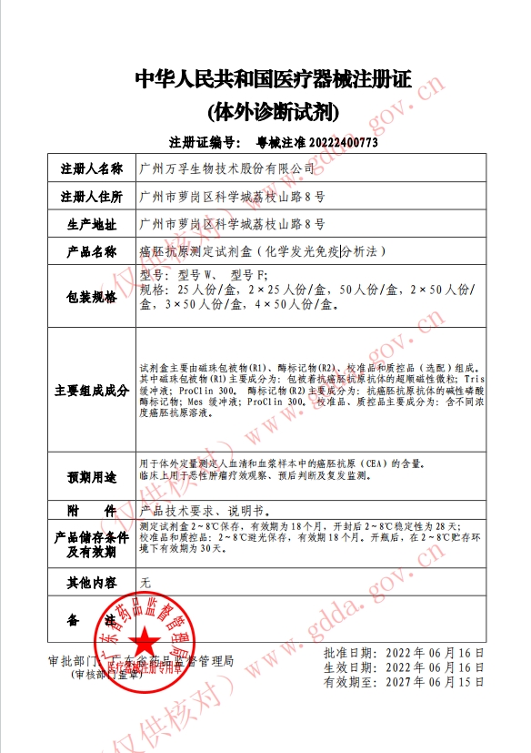 江西省+動(dòng)態(tài)第54批 癌胚抗原測(cè)定試劑盒(化學(xué)發(fā)光免疫分析法) 粵械注準(zhǔn)20222400773 50人份|盒 3250.0000