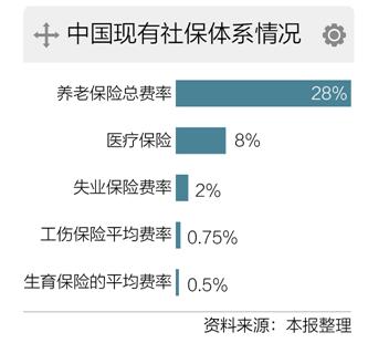中國社保體系主要由“五險一金”組成。其中,養(yǎng)老保險總費率28%(單位繳費20%、個人繳費8%)、醫(yī)療保險8%(單位繳費6%、個人繳費2%)、失業(yè)保險費率2%(單位、個人比例各省自定),工傷保險和生育保險由單位繳費個人不繳,工傷保險平均費率為0.75%,生育保險的平均費率為不超過0.5%。