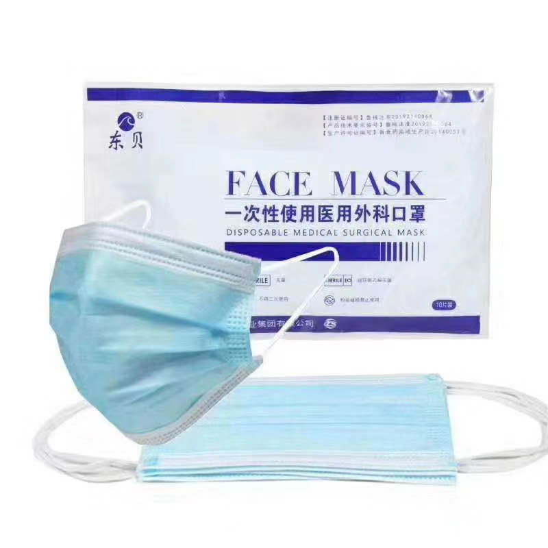 一次性醫(yī)用外科口罩由表層、中間層、底層、口罩帶、鼻夾組成,表層材料為聚丙烯紡粘布、中間層材料為聚丙烯噴絲法制成的過濾熔噴布、底層材料為聚丙烯紡粘布、口罩帶為滌綸線和少量氨綸線針織而成、鼻夾為可彎折可定型的聚丙烯制成,該產(chǎn)品供臨床醫(yī)務人員在有創(chuàng)操作過程中佩帶,覆蓋住使用者的口、鼻及下頜,為防止病原體微生物、體液、顆粒物等的直接透過提供物理屏障。