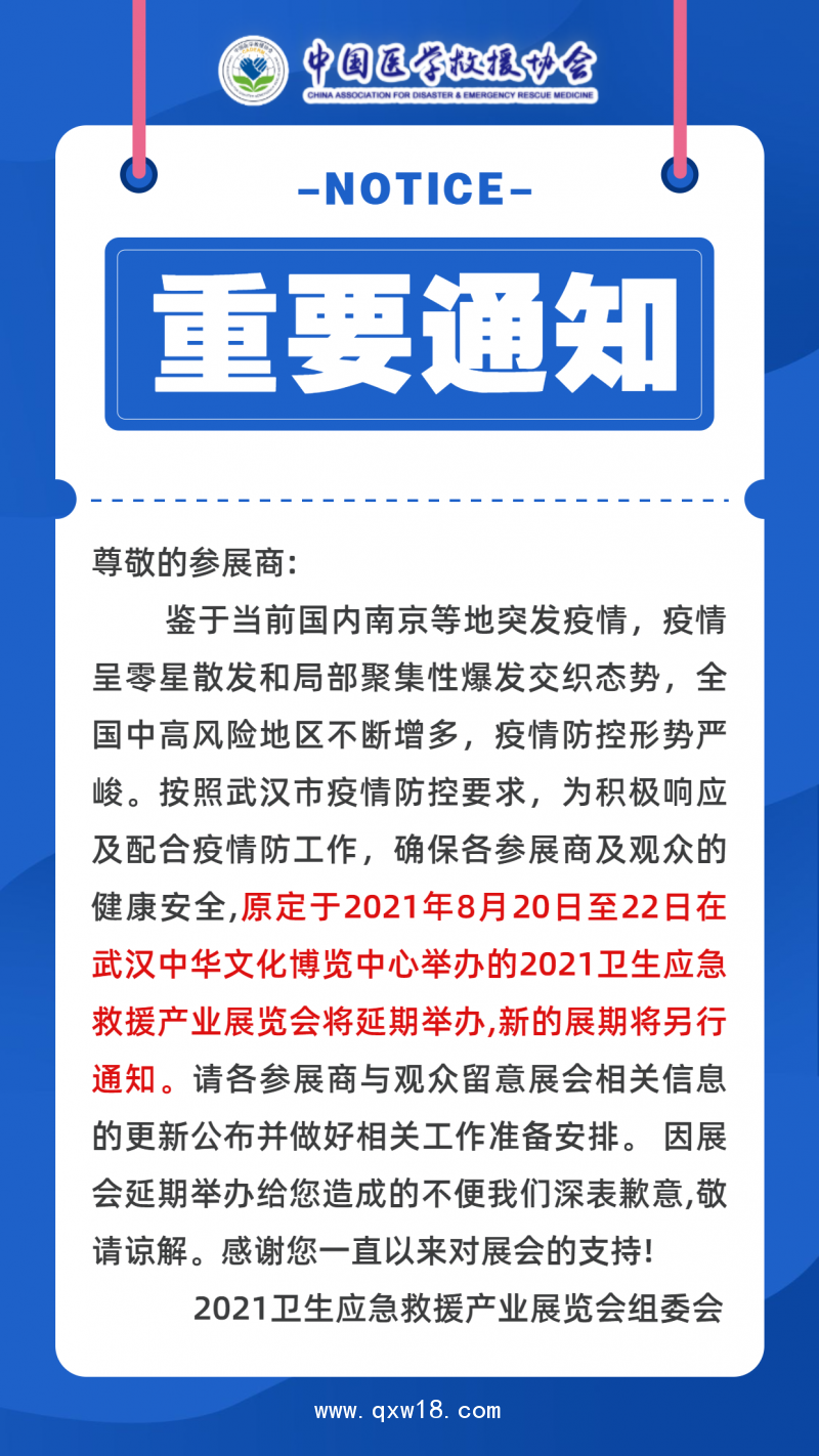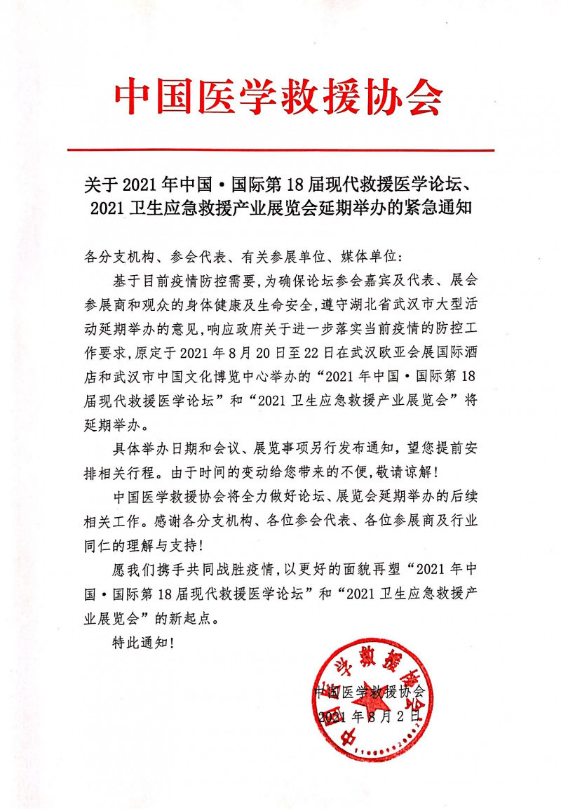 2021衛(wèi)生應(yīng)急救援產(chǎn)業(yè)展覽會暨第18屆現(xiàn)代救援醫(yī)學論壇延期通知
