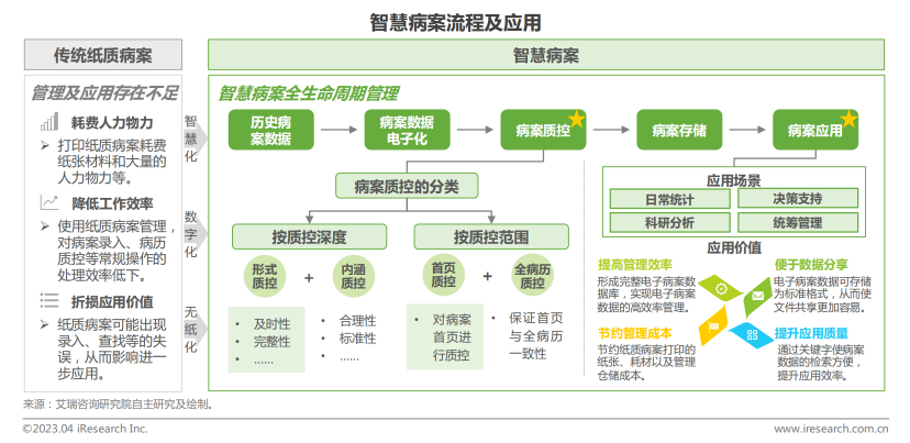 艾瑞咨詢指出,傳統(tǒng)醫(yī)院病案管理存在紙質病案占空間、耗資源、易損壞,病案錄入、病歷質控效率低等諸多問題。在此背景下,智慧病案應運而生,通過信息化及智能化技術,對醫(yī)療機構病歷/病案數(shù)據(jù)進行處理,幫助病案工作者實現(xiàn)了數(shù)據(jù)整合、數(shù)據(jù)質控、病案入庫歸檔、病案數(shù)據(jù)應用服務的統(tǒng)一集成。