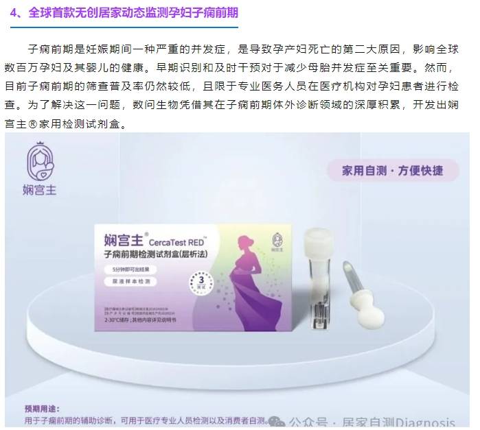 在孕期,準(zhǔn)媽媽們總是將寶寶的健康放在首位。然而,子癇前期作為孕期常見的高危疾病,往往讓人防不勝防。居家自測Diagnosis公眾號 近日發(fā)布了幾款居家健康監(jiān)測產(chǎn)品,其中全球首款無創(chuàng)居家動態(tài)監(jiān)測子癇前期的創(chuàng)新產(chǎn)品十分引人注目。這款產(chǎn)品不僅大大降低了孕婦在醫(yī)院頻繁檢測的負(fù)擔(dān),還為準(zhǔn)媽媽們提供了全新的健康管理方式。