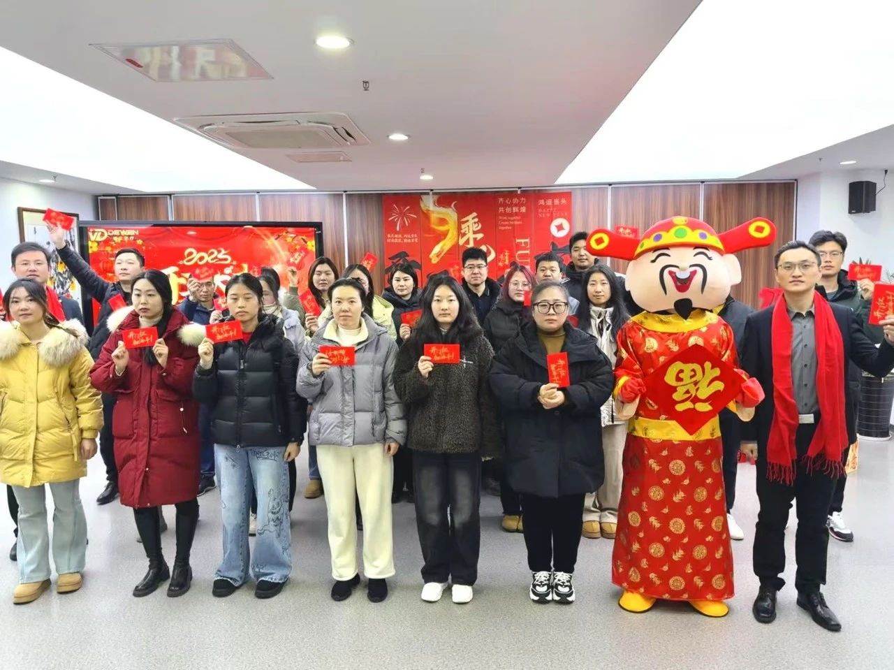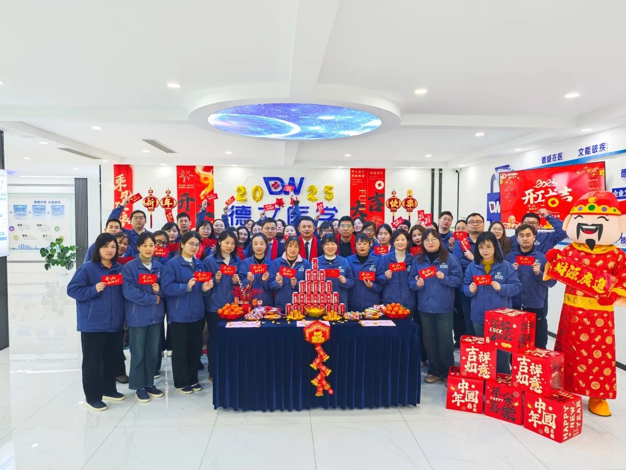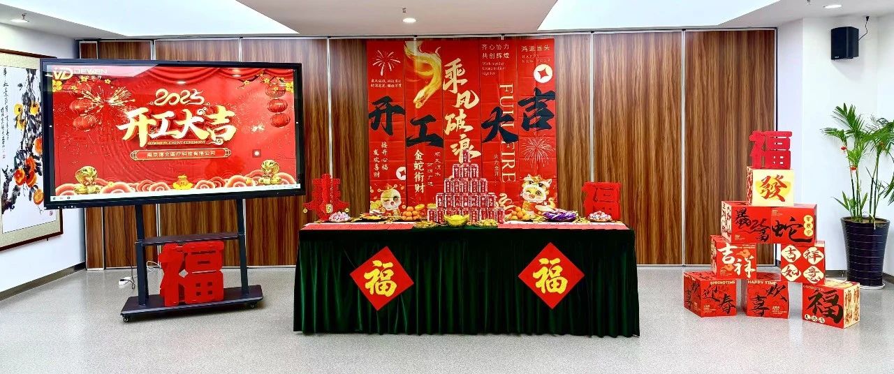 走進德文醫(yī)療的辦公區(qū)域,濃濃的年味與蓬勃的朝氣交織在一起。大廳被精心布置,火紅的對聯(lián)傳遞著新春的祝福,“開工大吉”的橫幅高懸,洋溢著喜慶與活力。精致的供品陳列整齊,承載著對新一年的美好祈愿,禮品箱有序擺放,為員工們送上貼心的關懷。天花板上獨特的星空裝飾,仿佛寓意著德文醫(yī)療在醫(yī)療領域這片浩瀚星空中,將不斷探索、閃耀光芒。