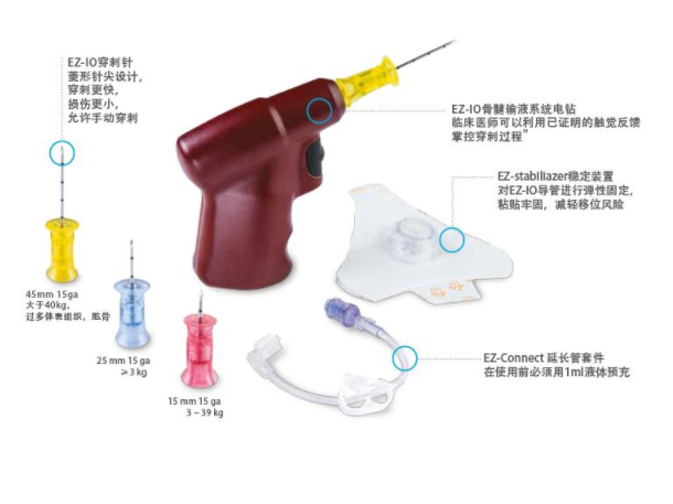 EZIO骨髓腔輸液系統(tǒng)是目前市面上一款電動機制的骨髓腔輸液裝置。建立給藥輸液通路時間最短,可以為搶救爭取寶貴時間,能解決困難靜脈危重患者的輸液給藥通路建立困難的問題。在加壓狀態(tài)下,根據(jù)志愿者研究估算的成人輸液速率大概是經(jīng)肱骨5L每小時,經(jīng)脛骨1L每小時;以上速度是在300mmHg的壓力下。任何可以通過外周靜脈途徑安全輸入的液體或藥物,都可以安全地通過骨內(nèi)(intraosseous,IO) 途徑輸入。重復(fù)劑量的高滲溶液輸入時需要謹慎。我們不推薦輸入化療藥物。骨內(nèi)的劑量與靜脈輸液的劑量一般是一致的。通過IO和靜脈途徑,藥物和液體到達中心循環(huán)的濃度相同。在多個國家,EZIO被推薦未IO通路的首選,目前在全球50多個國家使用,超過200萬例患者受益。美國國防部軍事采購Levels 2-5 使用的都是 Arrow? EZ-IO?。推薦IO血管通路的文章現(xiàn)已發(fā)表超過500篇,近半數(shù)以上推薦使用EZIO。