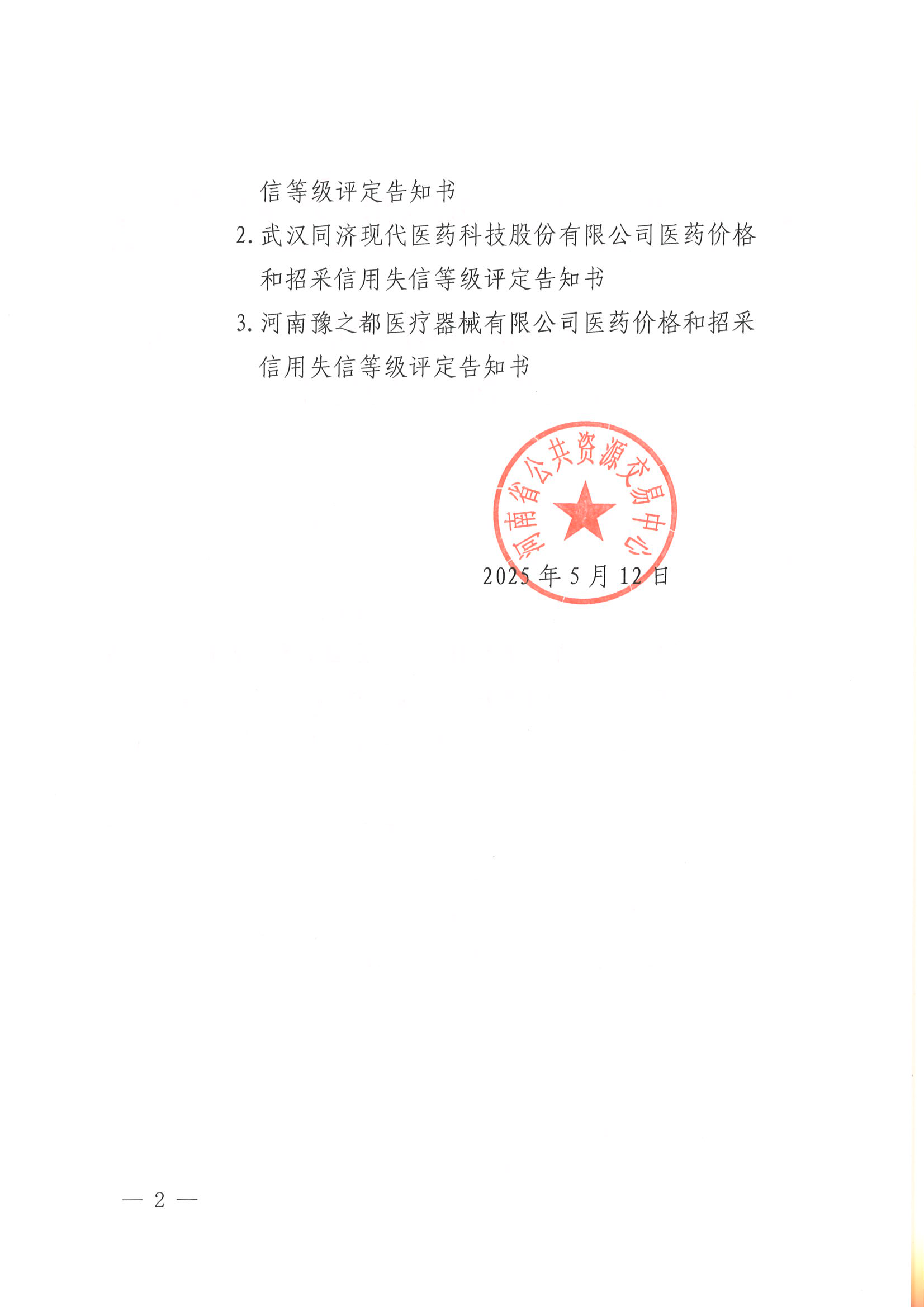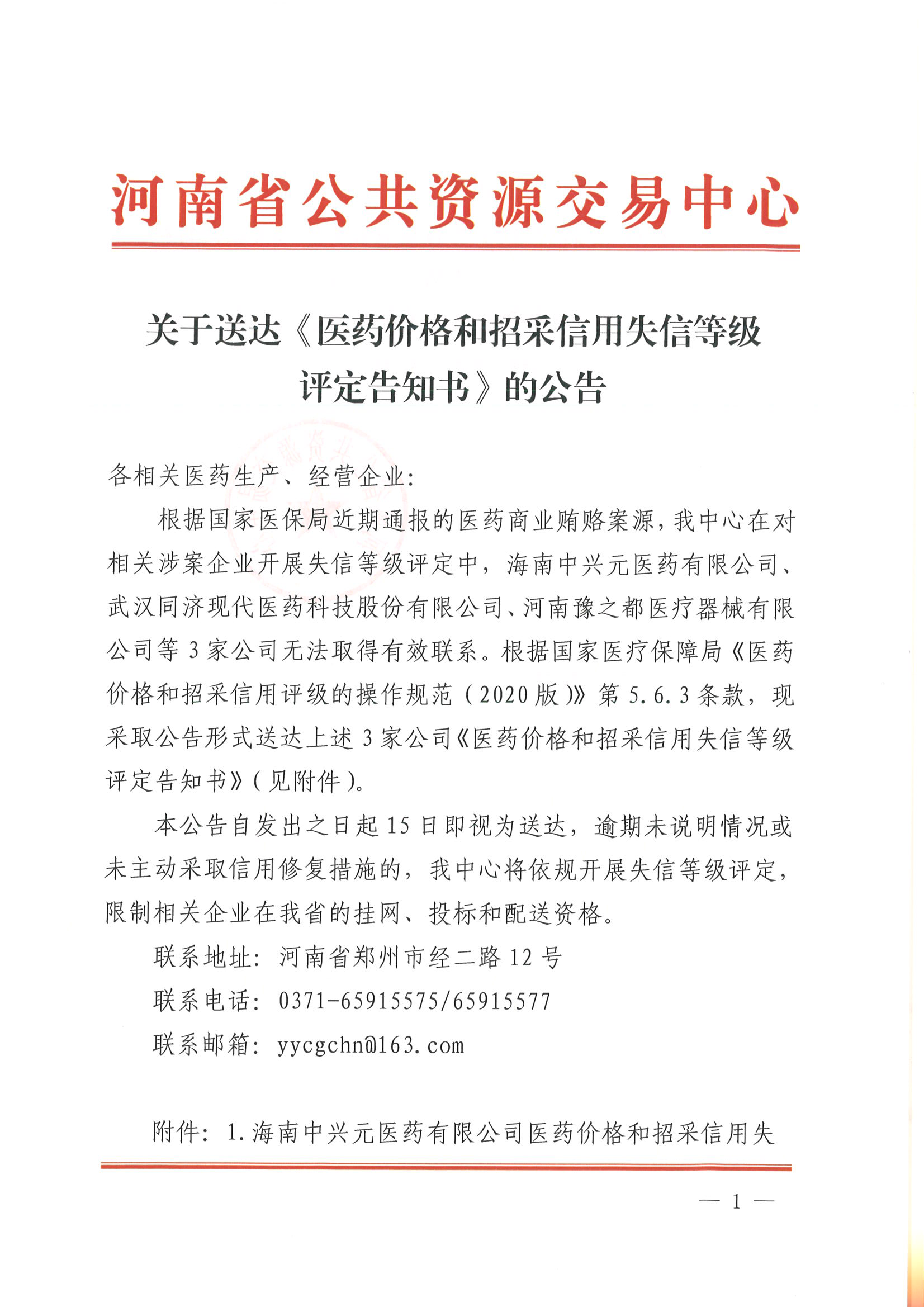 各相關(guān)醫(yī)藥生產(chǎn)、經(jīng)營(yíng)企業(yè):根據(jù)國(guó)家醫(yī)保局近期通報(bào)的醫(yī)藥商業(yè)賄賂案源,我中心在對(duì)相關(guān)涉案企業(yè)開展失信等級(jí)評(píng)定中,海南中興元醫(yī)藥有限公司、武漢同濟(jì)現(xiàn)代醫(yī)藥科技股份有限公司、河南豫之都醫(yī)療器械有限公司等3家公司無法取得有效聯(lián)系。根據(jù)國(guó)家醫(yī)療保障局《醫(yī)藥價(jià)格和招采信用評(píng)級(jí)的操作規(guī)范(2020版)》第5.6.3條款,現(xiàn)采取公告形式送達(dá)上述3家公司《醫(yī)藥價(jià)格和招采信用失信等級(jí)評(píng)定告知書》(見附件)。本公告自發(fā)出之日起15日即視為送達(dá),逾期未說明情況或未主動(dòng)采取信用修復(fù)措施的,我中心將依規(guī)開展失信等級(jí)評(píng)定,限制相關(guān)企業(yè)在我省的掛網(wǎng)、投標(biāo)和配送資格。聯(lián)系地址:河南省鄭州市經(jīng)二路12號(hào)聯(lián)系電話:0371-65915575/65915577聯(lián)系郵箱:[email protected]
