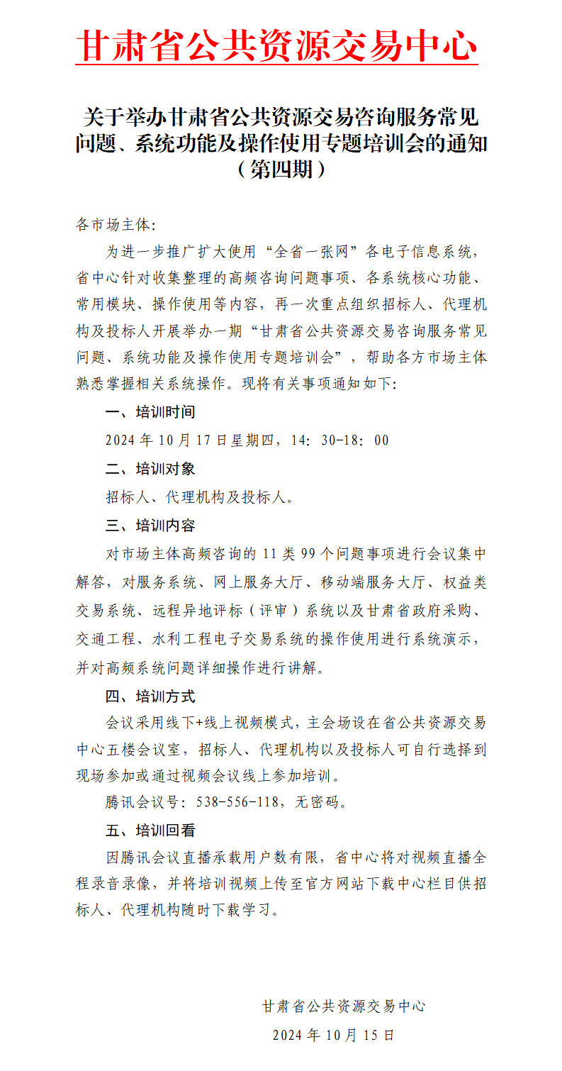 各市場(chǎng)主體:為進(jìn)一步推廣擴(kuò)大使用“全省一張網(wǎng)”各電子信息系統(tǒng),省中心針對(duì)收集整理的高頻咨詢問題事項(xiàng)、各系統(tǒng)核心功能、常用模塊、操作使用等內(nèi)容,再一次重點(diǎn)組織招標(biāo)人、代理機(jī)構(gòu)及投標(biāo)人開展舉辦一期“甘肅省公共資源交易咨詢服務(wù)常見問題、系統(tǒng)功能及操作使用專題培訓(xùn)會(huì)”,幫助各方市場(chǎng)主體熟悉掌握相關(guān)系統(tǒng)操作。現(xiàn)將有關(guān)事項(xiàng)通知如下:一、培訓(xùn)時(shí)間2024年10月17日星期四,15:00-18:00二、培訓(xùn)對(duì)象招標(biāo)人、代理機(jī)構(gòu)及投標(biāo)人。三、培訓(xùn)內(nèi)容對(duì)市場(chǎng)主體高頻咨詢的11類99個(gè)問題事項(xiàng)進(jìn)行會(huì)議集中解答,對(duì)服務(wù)系統(tǒng)、網(wǎng)上服務(wù)大廳、移動(dòng)端服務(wù)大廳、權(quán)益類交易系統(tǒng)、遠(yuǎn)程異地評(píng)標(biāo)(評(píng)審)系統(tǒng)以及甘肅省政府采購(gòu)、交通工程、水利工程電子交易系統(tǒng)的操作使用進(jìn)行系統(tǒng)演示,并對(duì)高頻系統(tǒng)問題詳細(xì)操作進(jìn)行講解。四、培訓(xùn)方式會(huì)議采用線下+線上視頻模式,主會(huì)場(chǎng)設(shè)在省公共資源交易中心五樓會(huì)議室,招標(biāo)人、代理機(jī)構(gòu)以及投標(biāo)人可自行選擇到現(xiàn)場(chǎng)參加或通過(guò)視頻會(huì)議線上參加培訓(xùn)。騰訊會(huì)議號(hào):538-556-118,無(wú)密碼。五、培訓(xùn)回看因騰訊會(huì)議直播承載用戶數(shù)有限,省中心將對(duì)視頻直播全程錄音錄像,并將培訓(xùn)視頻上傳至官方網(wǎng)站下載中心欄目供招標(biāo)人、代理機(jī)構(gòu)隨時(shí)下載學(xué)習(xí)。