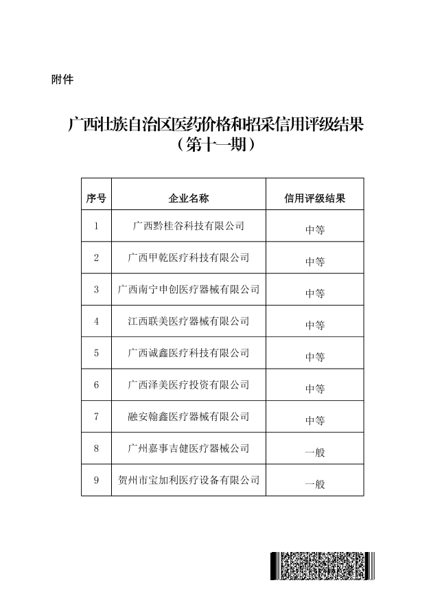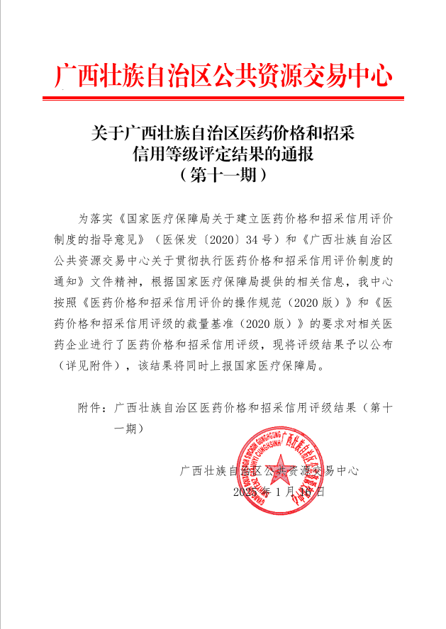 關(guān)于廣西壯族自治區(qū)醫(yī)藥價(jià)格和招采信用等級(jí)評(píng)定結(jié)果的通報(bào)(第十一期)