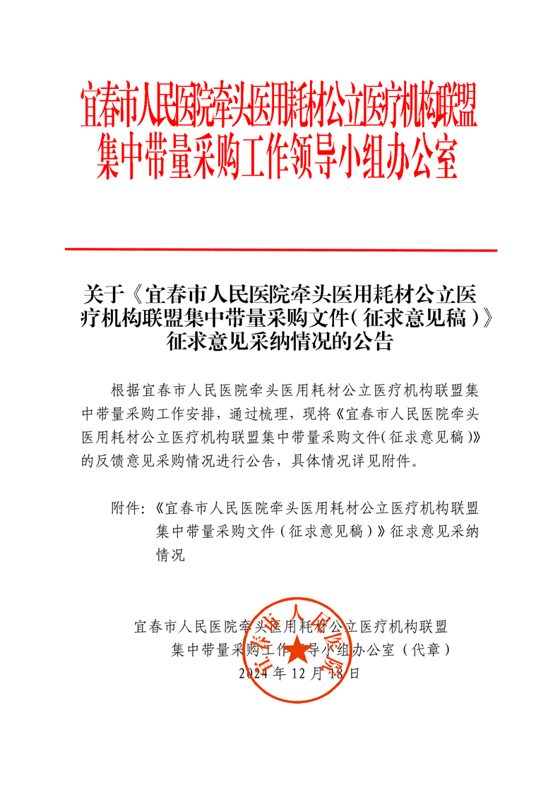 關(guān)于《宜春市人民醫(yī)院牽頭醫(yī)用耗材公立醫(yī)療機(jī)構(gòu)聯(lián)盟集中帶量采購(gòu)文件(征求意見(jiàn)稿)》征求意見(jiàn)采納情況的公告