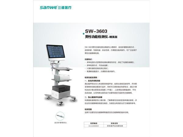 產(chǎn)品說明:男性功能檢測(cè)儀男性功能檢測(cè)儀由主機(jī)、探頭、電極、計(jì)算機(jī)、顯示器、打印機(jī)和診斷臺(tái)組成。產(chǎn)品特征男性功能檢測(cè)儀是用于男性性功