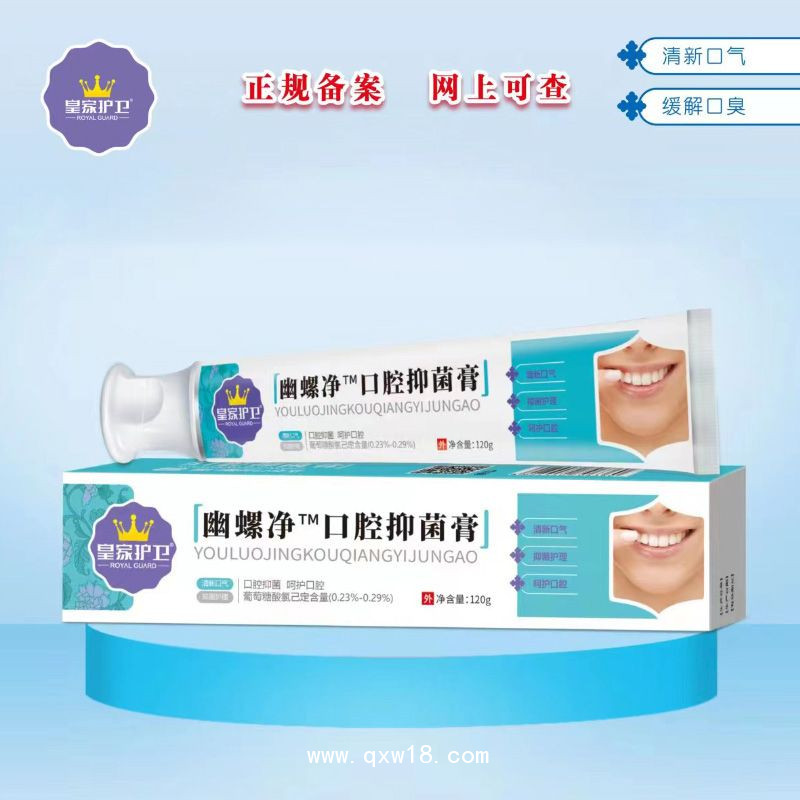 產(chǎn)品說明:產(chǎn)品名稱幽螺凈-口腔抑菌膏品牌名稱皇家護(hù)衛(wèi)注冊商標(biāo)皇家護(hù)衛(wèi)產(chǎn)品用途請見說明書使用方法早晚或者餐后使用,沾水刷牙并漱口;或
