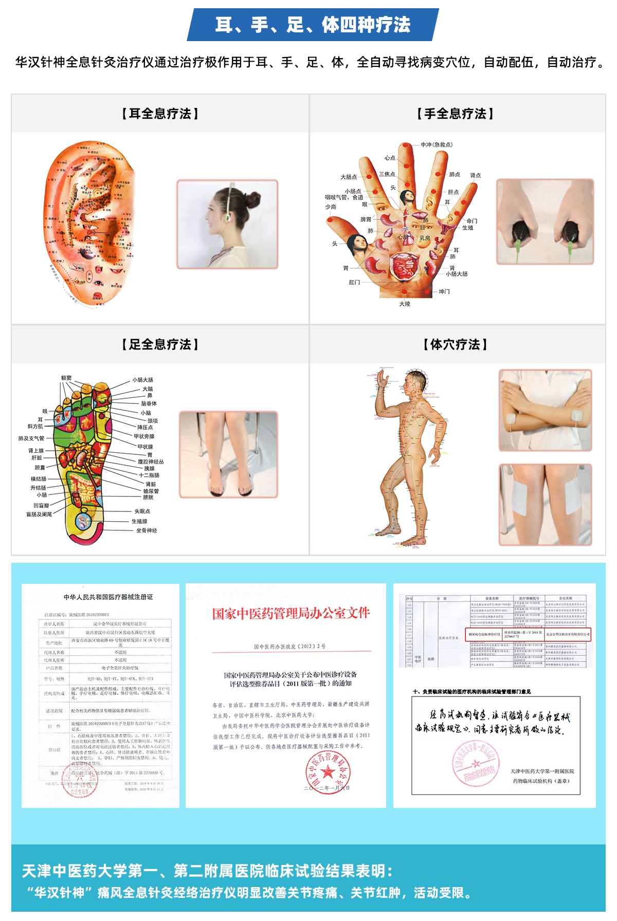 華漢針神痛風(fēng)治療儀,是根據(jù)中醫(yī)經(jīng)絡(luò)學(xué)、針灸原理,以及金華漢公司獨創(chuàng)的“人體凸出部位全息電子針灸療法”,搭載高科技智能芯片研制而成。主機使用的多種治療電極能覆蓋人體凸出部位耳手腳的穴位以及體穴,可以全方面快速疏通人體全身經(jīng)絡(luò),平衡人體氣血陰陽,在持續(xù)使用華漢針神痛風(fēng)治療儀過程中,通過刺激耳手腳上腎、肝、脾等相應(yīng)的穴位,改善代謝,加速尿酸排出體外,減少尿酸鹽沉積,逐步溶解痛風(fēng)石,疏通病變部位瘀阻經(jīng)絡(luò),消腫止痛。