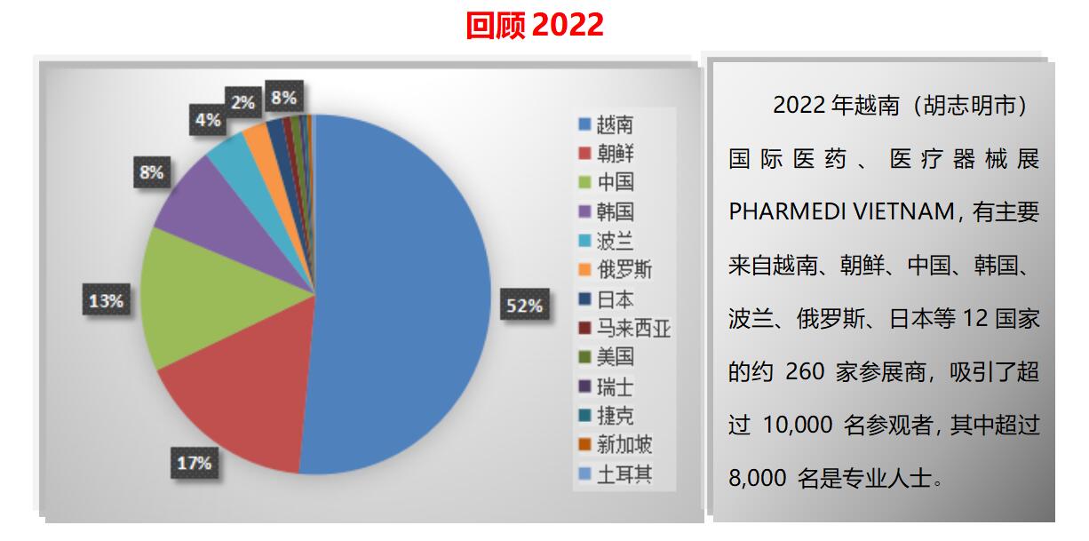 2022年越南(胡志明市)國(guó)際醫(yī)藥、醫(yī)療器械展PHARMEDI VIETNAM,有來(lái)自越南、韓國(guó)、馬來(lái)西亞、日本、俄羅斯、中國(guó)、波蘭等12國(guó)家的約 260 家參展商,吸引了超過(guò) 10,000 名參觀者,其中超過(guò) 8,000 名是專(zhuān)業(yè)人士。