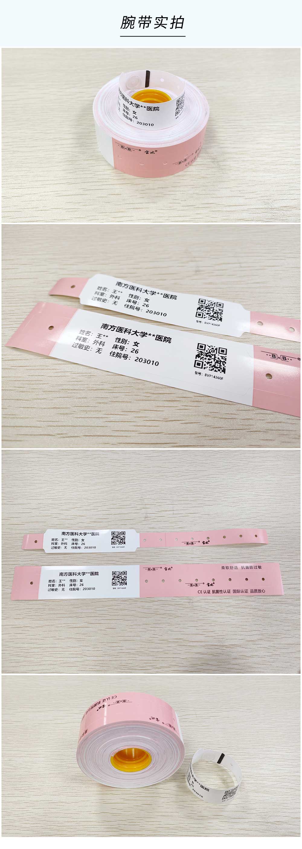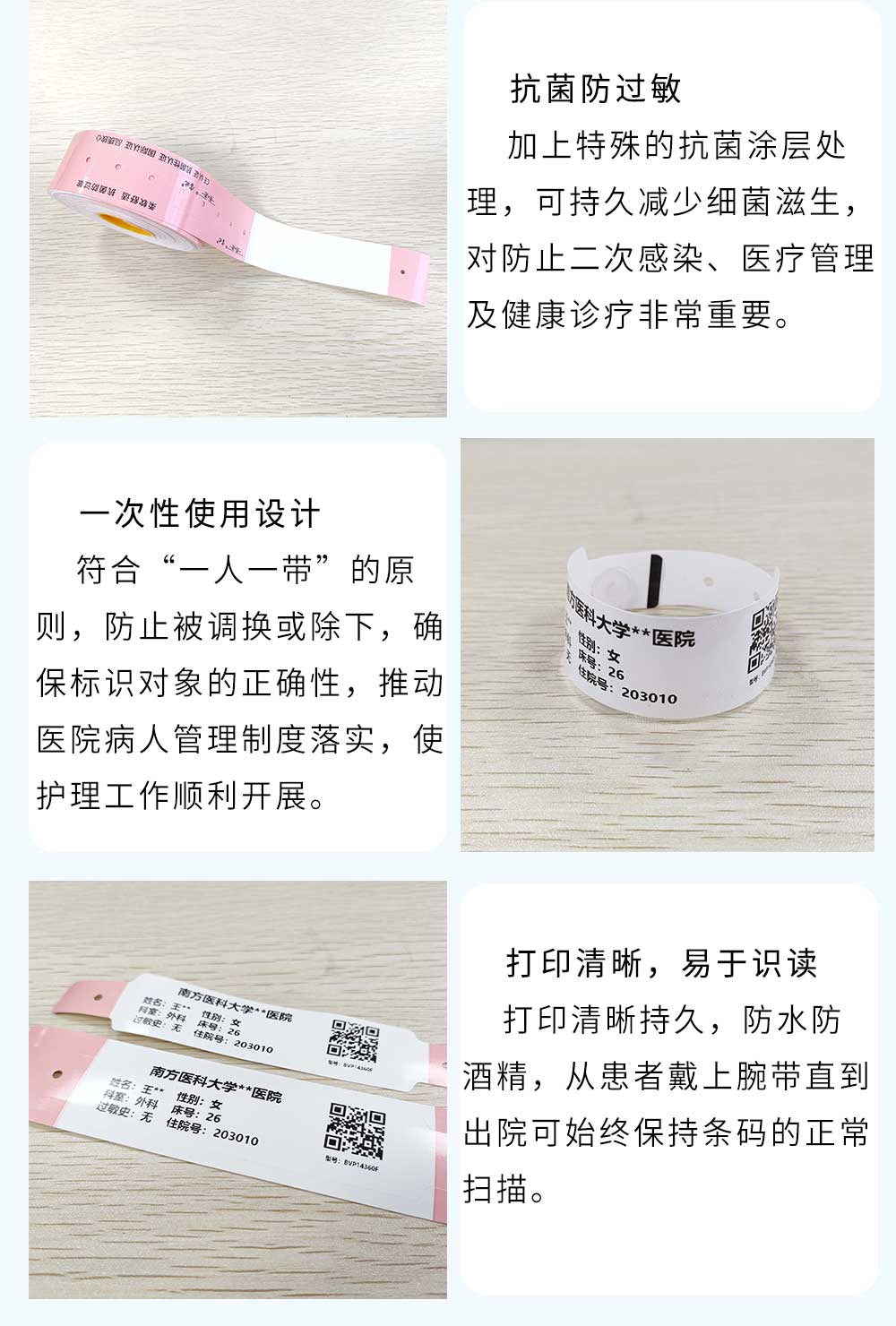 熱敏材質(zhì);一次性使用,不可轉(zhuǎn)移;防水防酒精,抗菌防過敏,國際認(rèn)證,品質(zhì)放心!可根據(jù)客戶需求自定義文字,一維碼,二維碼,圖片等打印內(nèi)容,且能在數(shù)秒內(nèi)通過寶比腕帶打印機(jī)BB777打印出來