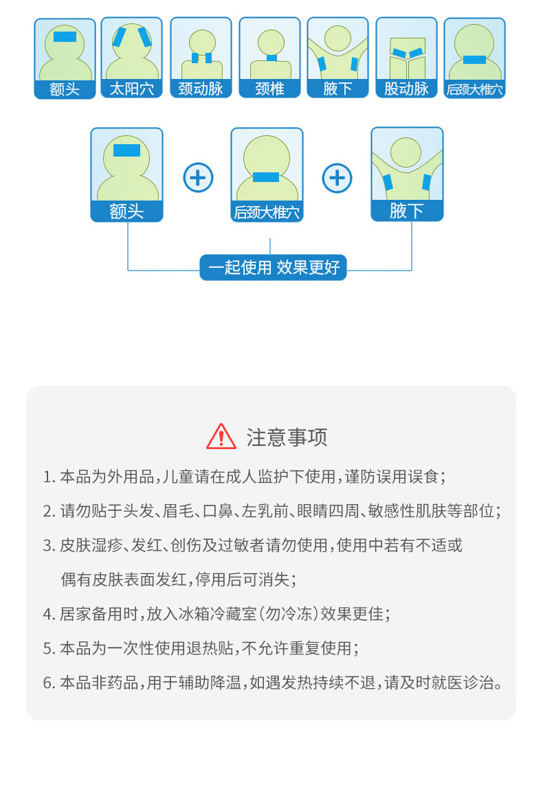 2、為加快降溫速度可加用數(shù)貼,同時(shí)貼在人體左右頸總動(dòng)脈、左右股動(dòng)脈處;
