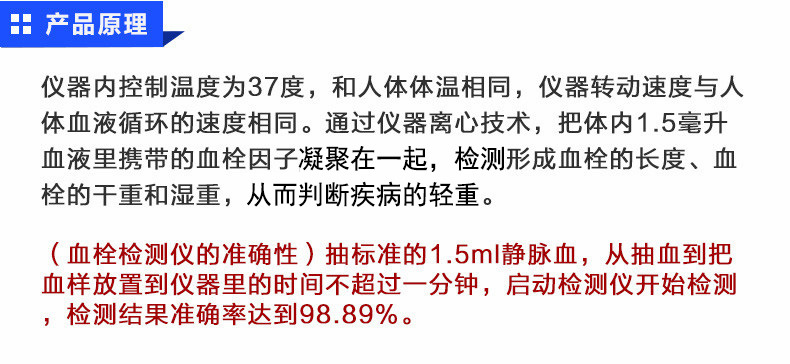 五、最新款血栓檢測儀的準確性: 抽標準的1.5ml靜脈血,從抽血到把檢查的血樣放置到儀器里面的時間不超過一分鐘,啟動檢測儀開始檢測,檢測得出的結(jié)果準確率達到98.89%。