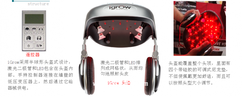 1、iGrow是首款治療頭發(fā)稀疏和損傷的免提式便攜器械。iGrow中含有高質(zhì)量的激光二極管,以及高亮度的發(fā)光二極管。iGrow內(nèi)置5種不同的程序,便于用戶根據(jù)自身情況自定義治療過程。
