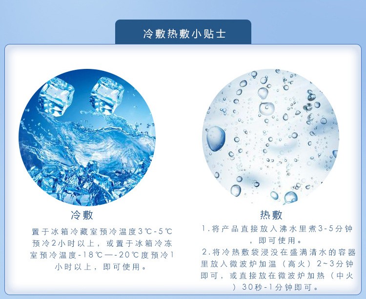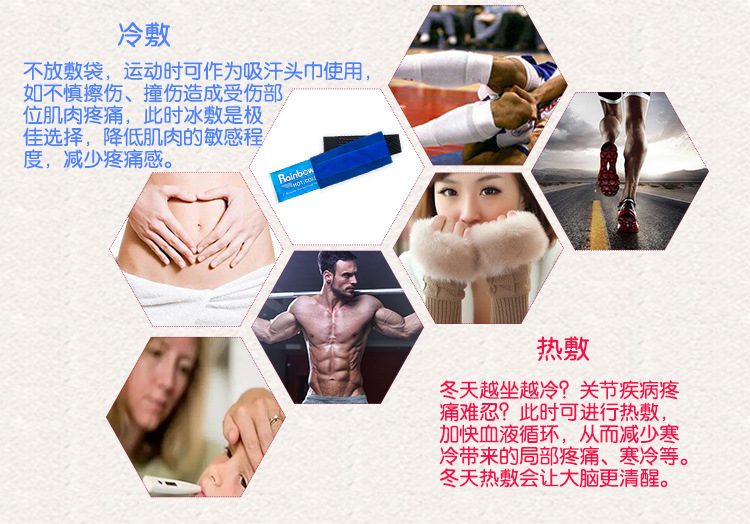 1、本品由高聚化合物及多種生物元素組成,對(duì)人體無毒無任何副作用。科學(xué)的配方使敷袋富有彈性且在零下20℃的環(huán)境中長時(shí)間存放仍能保持柔軟的手感,俗稱“不凍冰袋”。