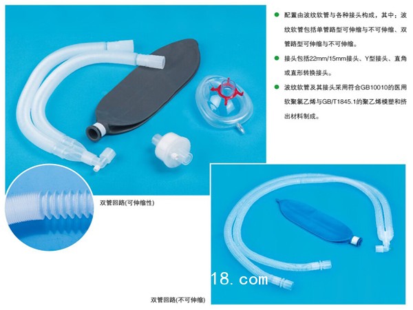 呼吸管路適用于與麻醉機、呼吸機和霧化器配合使用,建立人工呼吸通道。