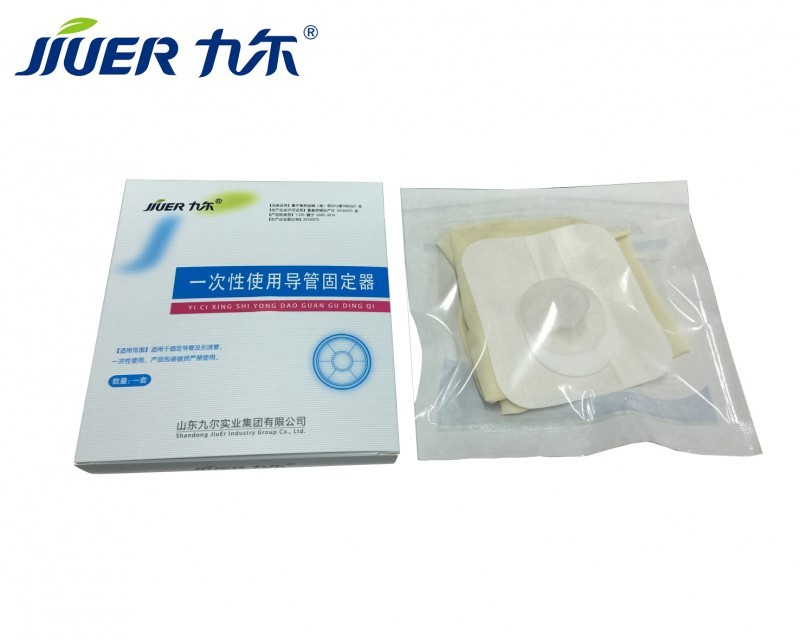 3、從棉墊開口處將棉墊套在引流導管上,貼于皮膚,再從固定盤開口處將固定盤套在引流管上,使其緊貼棉墊,將固定貼敷于固定盤上,粘貼牢固。