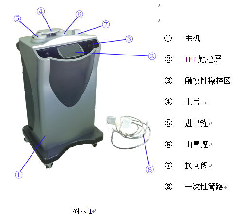 ??? 該產(chǎn)品由主機(jī)(氣缸、活塞、單片機(jī)控制電路板、顯示屏)和一次性管路組成(圖示1):