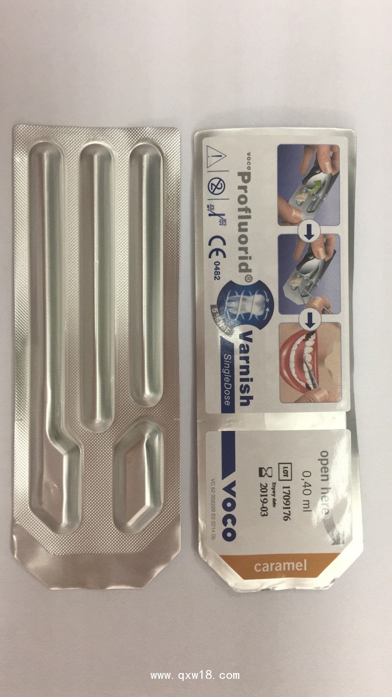 VOCO Profluorid Varnish(以下簡(jiǎn)稱V.P.V)是一種可預(yù)防治療齲齒和牙齒敏感的脫敏糊劑。V.P.V 為乙醇松香懸液,每 1 ml 含 50 mg 氟化鈉,相當(dāng)于 22.6 mg氟,可用于迅速封閉牙本質(zhì)小管(如窩洞預(yù)備貨真對(duì)敏感的牙根表面);還可用于牙釉質(zhì)和牙本質(zhì)的表面涂氟,會(huì)在牙齒表面形成氟化鈣沉淀,保護(hù)牙齒;也可促進(jìn)牙齒再礦化,有助于長(zhǎng)期形成氟磷灰石。對(duì)于乳牙的防齲也有很好的功效。