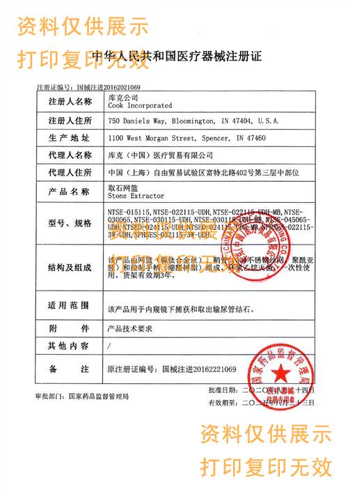 適用范圍:該產(chǎn)品用于內(nèi)窺鏡下捕獲和取出輸尿管結(jié)石。
