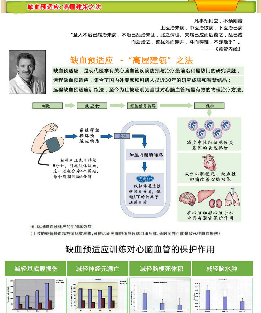 對人的心、腦等重要器官在預先接受短暫、非致病的缺血缺氧后,使致產(chǎn)生自身內(nèi)源性保護物質(zhì)(如腺苷、緩激肽、一氧化氮等……),從而減輕隨后持續(xù)更長時間缺血引起的心肌梗死和腦梗塞,降低心腦血管疾病的致殘率和死亡率。這種現(xiàn)象稱為缺血預適應(ischemic preconditioning)。隨后的臨床研究發(fā)現(xiàn),這種保護作用,不但出現(xiàn)在同一器官之中,而且肢體等器官的缺血預適應也可減輕心、腦、腎、肺、肝臟等器官的嚴重缺血引起的后果,稱為遠程缺血預適應(remote ischemic conditioning) 。