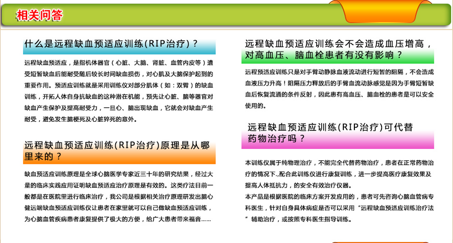 遠(yuǎn)程缺血預(yù)適應(yīng)是在1986年由美國murry博士率先提出的,簡單來說就是經(jīng)常對人體進(jìn)行反復(fù)的、短暫的、無創(chuàng)傷、無危害的缺血預(yù)適應(yīng)訓(xùn)練。能夠激發(fā)人體免疫系統(tǒng)的應(yīng)急機(jī)制。產(chǎn)生和釋放內(nèi)源性保護(hù)物質(zhì)(如:腺苷、緩激肽、一氧化氮等。這些物質(zhì)參與保護(hù)心肌和能量代謝)減輕和抵抗隨后更長時(shí)間因?yàn)槿梭w缺血缺氧造成的損傷。有效的避免發(fā)生腦梗死,心臟猝死等心腦血管疾病的意外發(fā)生(緩解三高、物理康復(fù)治療)