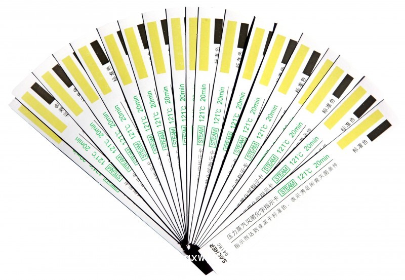 本產品是專用于壓力蒸汽滅菌的化學指示卡,長條形結構,指示卡表面帶有化學指示劑發(fā)生化學變化,并伴有顏色改變,由淺黃變成褐色或黑色。其他顏色的深淺與蒸汽的溫度、濕度及持續(xù)的時間密切相關。如果指示卡顏色無變化或變色淺于標準色,則表明未達到規(guī)定的滅菌溫度和時間。