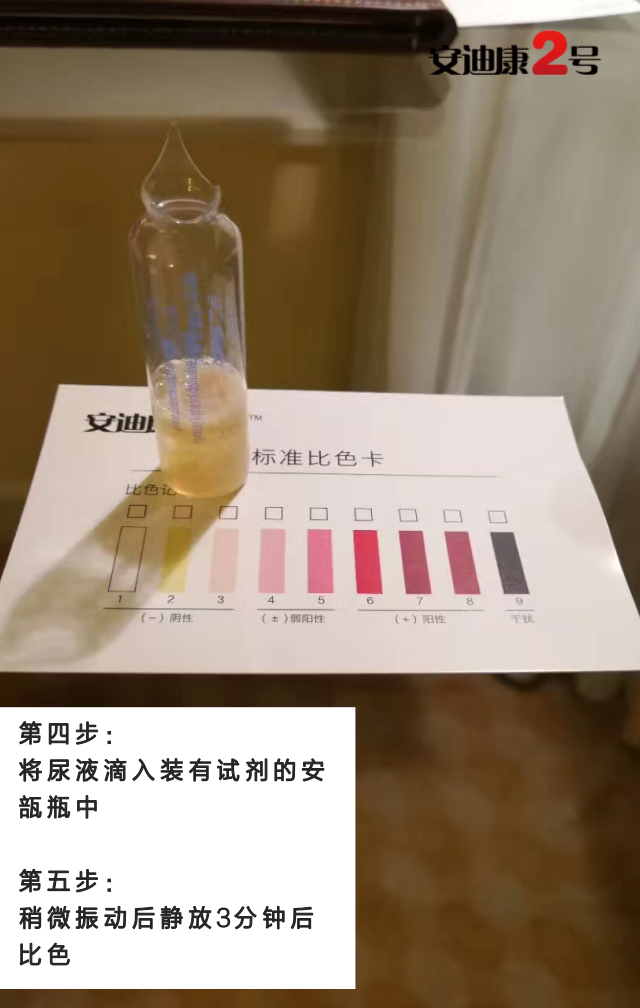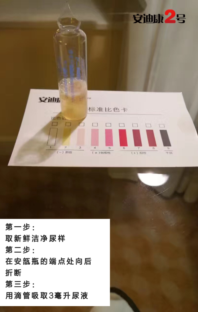 ?檢驗原理:本試劑與尿液中的單羥酚衍生物發(fā)生特征性顯色反應,通過反應沉淀物的顏色變化,以此判斷受試者體內(nèi)是否有相關的氨基酸異常代謝。????檢驗方法:取新鮮清潔尿樣(最好是早晨第一次尿液)3ml加入裝有試劑的安瓿中,靜置。溫度在20℃以上時,反應結果為3分鐘以內(nèi),溫度低于20℃時,可用37℃水浴加溫。將沉淀物顏色與標準色板對照以判定結果。安迪康二號主要優(yōu)勢v操作簡單--敲開安瓿瓶后可進行自測,保護被測者隱私。v方便快捷--與被測物反應三分鐘后觀察結果。v節(jié)省費用--癌癥早發(fā)現(xiàn),降低醫(yī)療費用,提高治愈率。v高效準確--嚴格按照說明書操作,反應結果與疾病相關度可達99%。