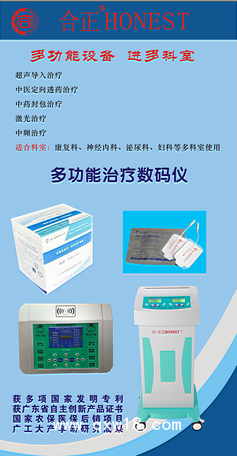 合正HONEST多功能數(shù)碼治療儀是一臺儀器價格,四臺儀器功能;產(chǎn)品集超聲,中頻,激光,中藥,音樂療法,穴位療法為一體;多種型號,適合社區(qū)醫(yī)院,鄉(xiāng)鎮(zhèn)醫(yī)院,中,大型醫(yī)院均可使用;領(lǐng)先科技,設(shè)備已獲得國家發(fā)明專利;國家計算機(jī)軟件著作權(quán)登記證證書;多種療法為一體,效果更直接;耗材獲兩項(xiàng)國家發(fā)明專利;廣東省自主創(chuàng)新產(chǎn)品;專機(jī)專用,獨(dú)立耗材,國家專利保護(hù);多功能儀器,多種耗材,進(jìn)多科室