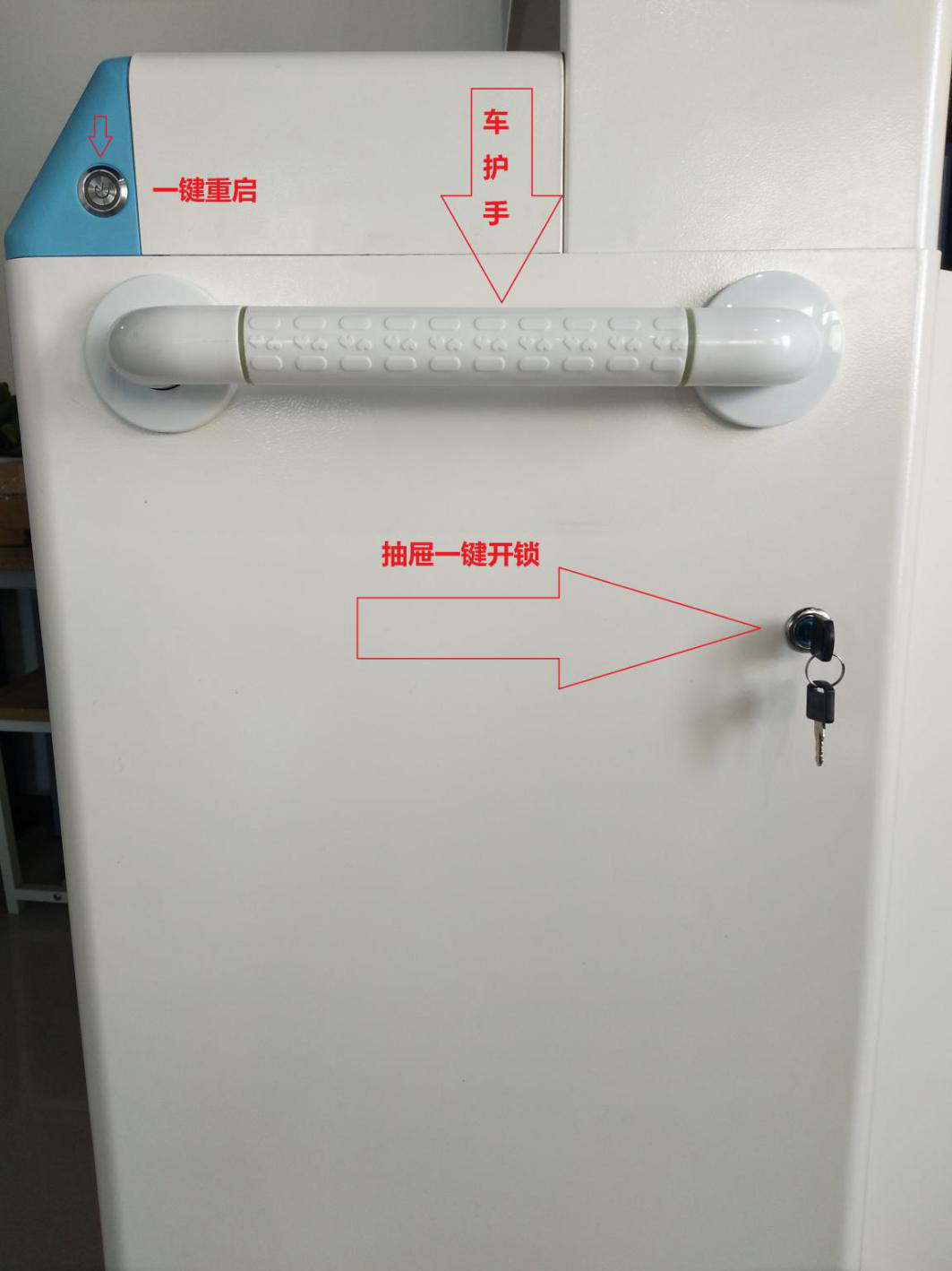 每一個抽屜都帶有電控鎖。最大程度保護麻醉藥品的安全。電控鎖進行過消音改造,目前噪音符合手術室噪音要求。另外柜體設計有層抽屜一鍵開鎖功能。配置有緊急解鎖裝置,在外部無法供電和UPS電源耗盡的時候,方便快速取藥,直接一鍵開鎖,打開所有抽屜。