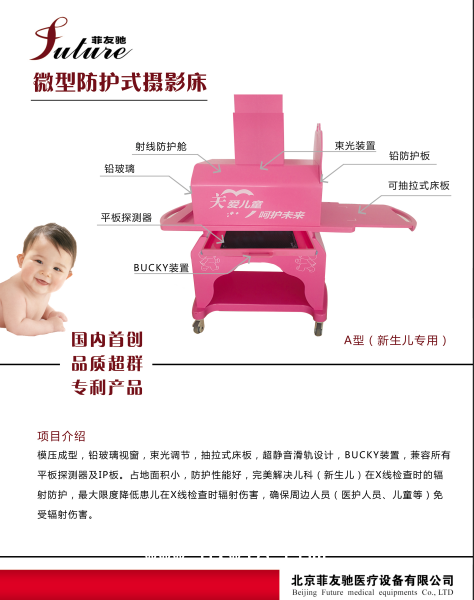 微型防護(hù)式攝影床由FYC-baby型手動(dòng)攝影平床及FYC - RPⅠ型X射線防護(hù)艙組成,主體采用鑄鉛工藝,配鉛玻璃窗口,便于觀察。束光裝置可調(diào)節(jié)照射視野窗口,抽拉式床板采用超靜音滑軌設(shè)計(jì),床體移動(dòng)靈活、占地面積小、防護(hù)性能好,能有效確保周邊人員(醫(yī)護(hù)人員、兒童及家屬等)免受輻射傷害,解決兒科,新生兒在X線檢查時(shí)的射線防護(hù)問題。并可與任何X線攝片機(jī)及不同尺寸平板探測(cè)器配套使用。