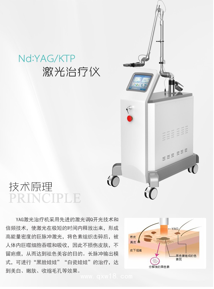 Nd:YAG/KTP激光治療機采用先進的激光調(diào)Q開光技術(shù)和倍頻技術(shù),使激光在極短的時間內(nèi)釋放出來,形成高能量密度的巨脈沖激光,將色素組織擊碎后,被人體內(nèi)巨噬細胞吞噬和吸收,因此不損傷皮膚,不留疤痕,從而達到祛色美容的目的。長脈沖輸出模式,可進行“黑臉娃娃”“白瓷娃娃”的治療,達到美白、嫩膚、收縮毛孔等效果。