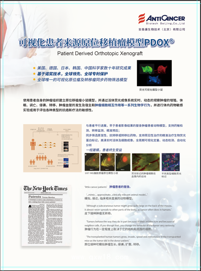 ? ? ? ?安泰康生物技術(shù)(北京)有限公司是美國(guó)ANTICANCER.IND在華的合資公司,以數(shù)十年研發(fā)、全球,并經(jīng)700余項(xiàng)科研驗(yàn)證的患者組織原位抑制小鼠技術(shù)為患者篩選有效的抗轉(zhuǎn)移藥物,最大限度延長(zhǎng)患者的無(wú)病生存期,提高患者的生存質(zhì)量,延長(zhǎng)總生存期。安泰康生物技術(shù)(北京)有限公式誠(chéng)邀具備腫瘤臨床資源的經(jīng)銷商、臨床團(tuán)隊(duì)及個(gè)人共同推廣腫瘤患者抗轉(zhuǎn)移藥物篩選技術(shù),服務(wù)患者。
