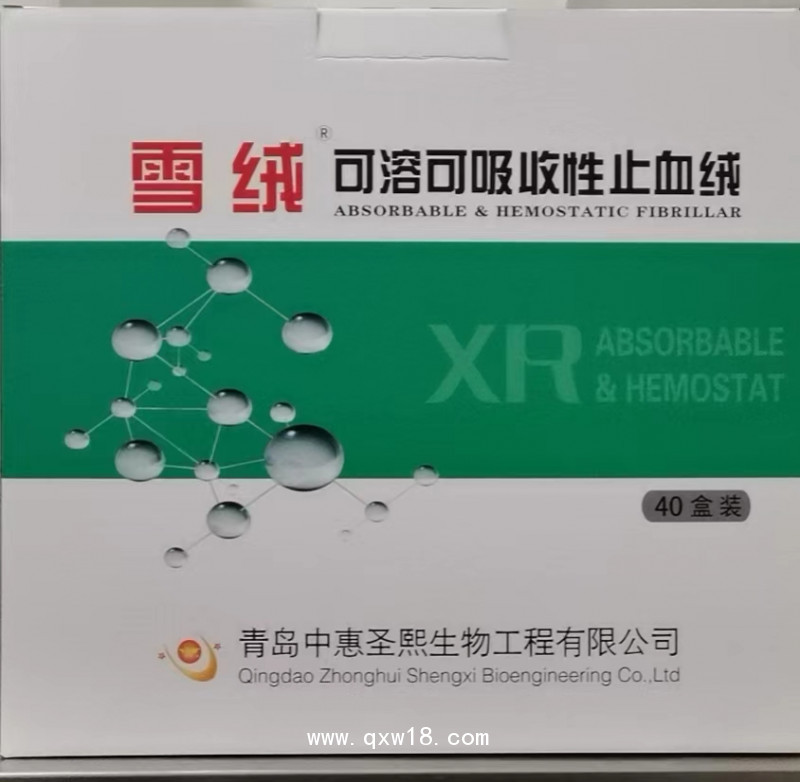 可溶可吸收性止血絨(雪絨)系采用天然粘膠纖維通過物化反應(yīng)制備而成的一種無菌可吸收的短纖,其具體材料組成為異性羧甲基醚纖維素鈉。外觀色澤均勻、經(jīng)輻射滅菌,一次性使用。