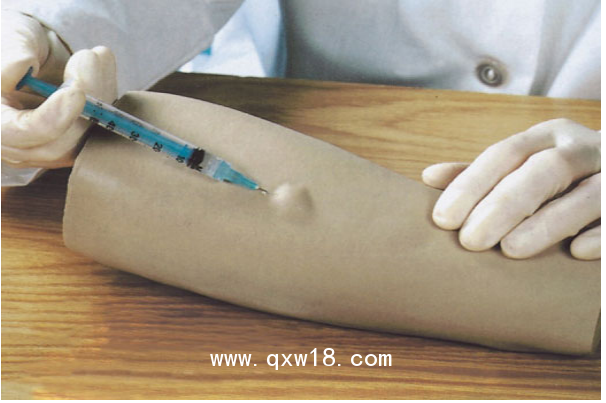 手臂共提供8個部位進行皮試練習(xí),期中四個部位有不同等級紅丘色標志。如果液體注射正確,皮膚上九會出現(xiàn)一個皮丘,抽出液體后這個皮丘就會消失。