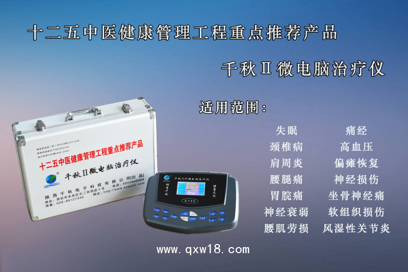 ? ?千秋Ⅱ微電腦治療儀,是我公司自主研發(fā)設(shè)計(jì)的中頻治療儀,結(jié)合了我國傳統(tǒng)的中醫(yī)、針灸、中藥理論和現(xiàn)代電腦技術(shù)。采用了智能化設(shè)計(jì)中頻0.5-12000Hz及干擾電技術(shù)的電脈沖模擬針灸,模擬傳統(tǒng)推拿療法,有推、拿、按、捶、振、揉等多種手法疏通經(jīng)絡(luò)、活血化瘀、扶正祛邪,是標(biāo)本兼治的優(yōu)選療法。