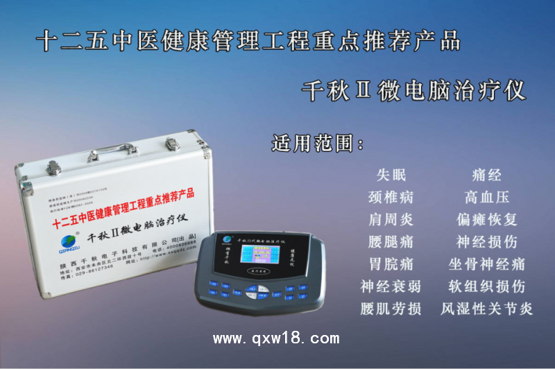? 千秋Ⅱ微電腦治療儀,是我公司自主研發(fā)設(shè)計(jì)的中頻治療儀,結(jié)合了我國(guó)傳統(tǒng)的中醫(yī)、針灸、中藥理論和現(xiàn)代電腦技術(shù)。采用了智能化設(shè)計(jì)中頻0.5-12000Hz及干擾電技術(shù)的電脈沖模擬針灸,模擬傳統(tǒng)推拿療法,有推、拿、按、捶、振、揉等多種手法疏通經(jīng)絡(luò)、活血化瘀、扶正祛邪,是標(biāo)本兼治的優(yōu)選療法。